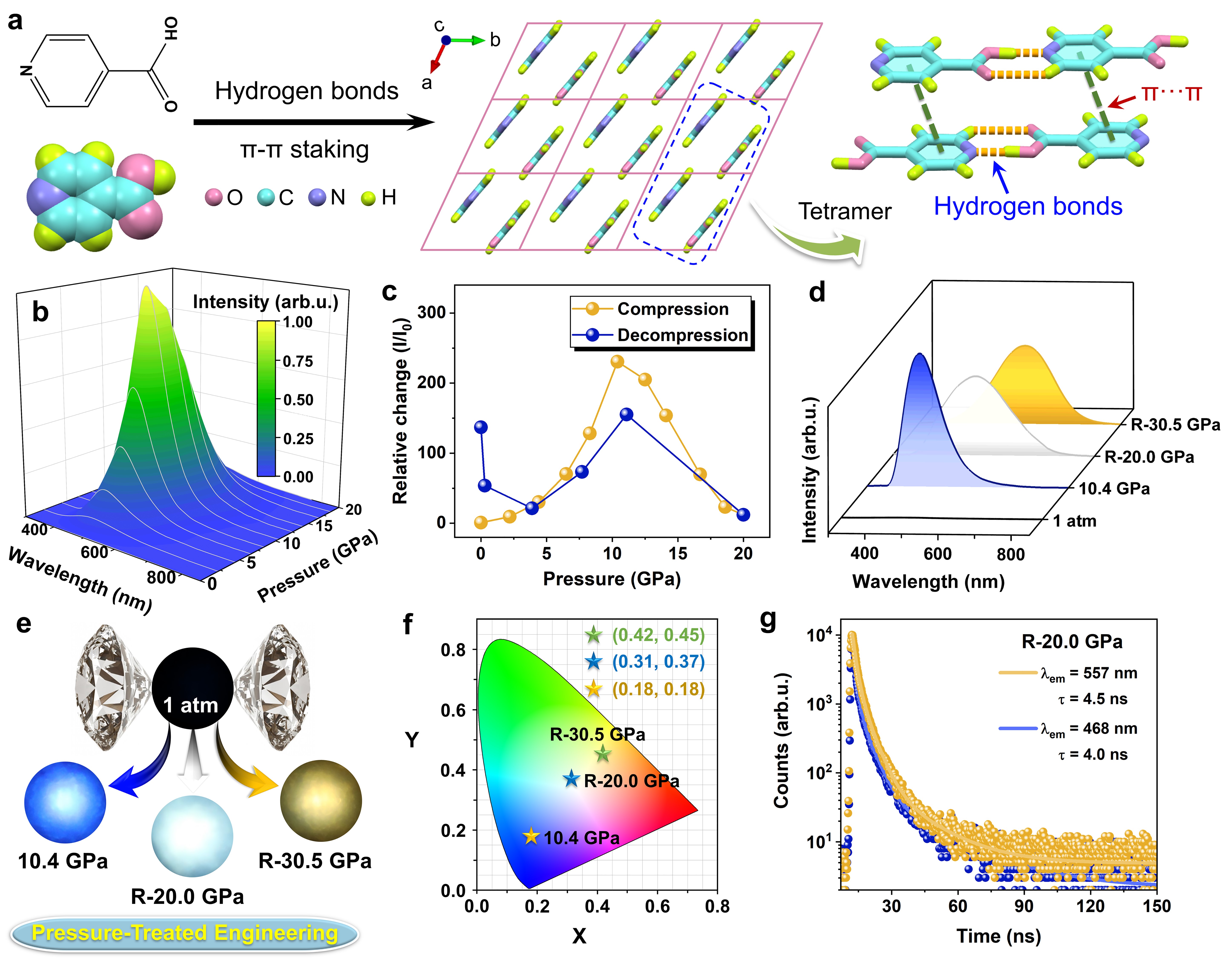 近日,吉林大学高压与超硬材料全国重点实验室/综合极端条件高压科学中心杨新一教授课题组在有机分子的多色发光研究方面取得重要进展。提出利用压强工程调控初始不发光的异烟酸(INA)材料中分子间双电荷转移强度,实现从暗态到高质量多色发射(即蓝光、白光、黄光)的可控切换。相关研究成果以“Controllable multicolor emission from initially non-emissive organic molecules by pressure engineering”为题发表在《自然通讯》(Nat. Commun. 2025, 16, 8780)上。