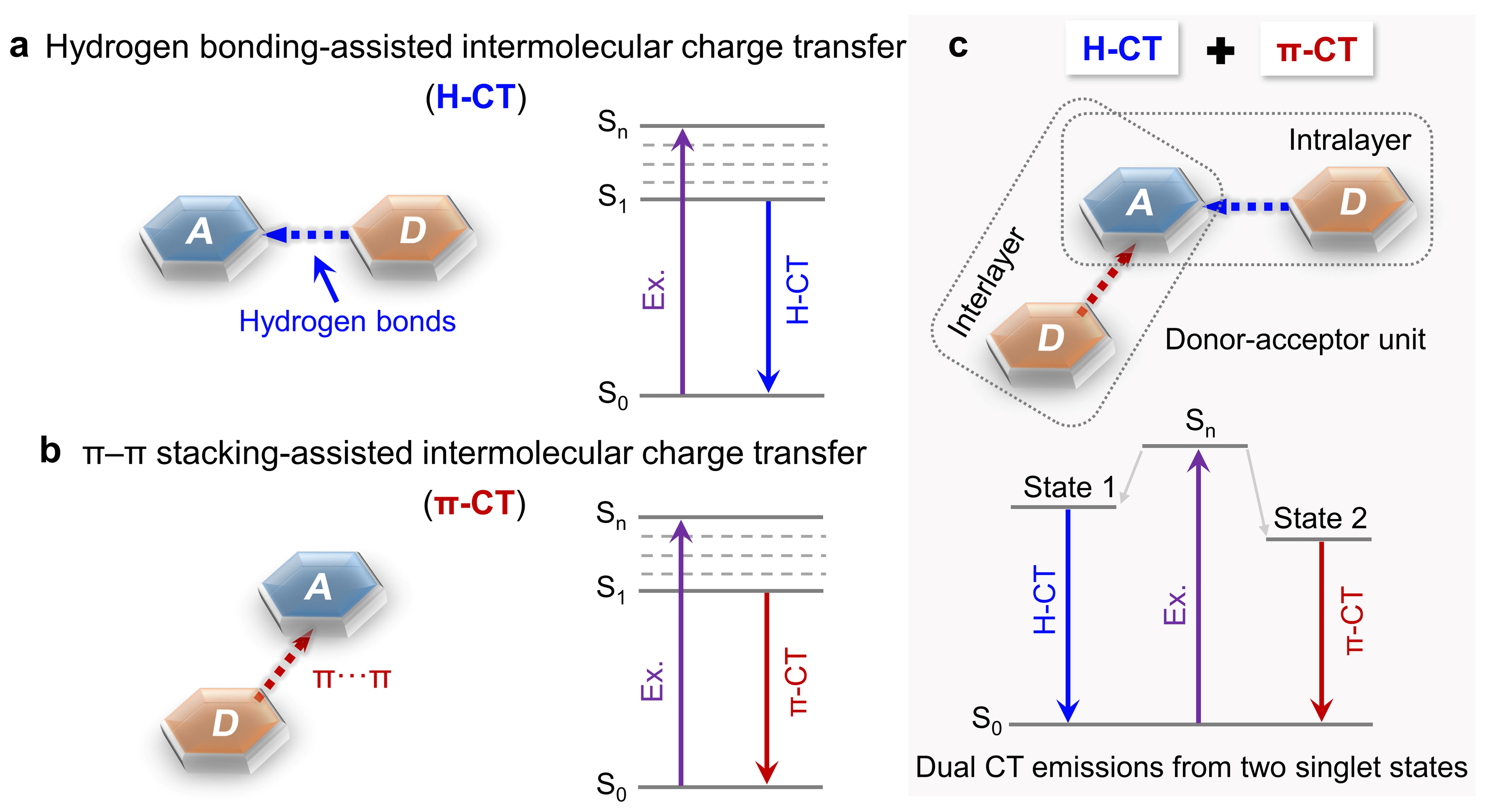 在本工作中,杨新一课题组以初始不发光的INA作为研究对象,引入氢键辅助的分子间电荷转移(H-CT)和π–π堆积辅助的分子间电荷转移(π-CT),通过压强工程有效地调节层内和层间的分子间电荷转移强度,从而实现了从暗态向高质量多色发光(即蓝光、白光和黄光)的转换。系统的光物理表征结果表明,压力诱导的氢键增强打破了先前禁阻的层内分子间电荷转移跃迁,从而触发了光致发光开启行为。经过不同的压强处理,在环境条件下我们获得了CIE坐标为(0.31, 0.37)的明亮白光和CIE坐标为(0.42, 0.45)的黄光。原位高压光谱表征结合第一性原理计算分析表明,白光归因于层内H-CT和层间π-CT之间的协同效应。更高压强处理后,由于层间距离的减小,π–π堆积作用增强,导致发射显著红移至黄光。基于大腔体压机制备宏量样品,制备了白光和黄光pc-LEDs,显示了其在照明等方面的应用潜力。这一发现不仅赋予了非发光有机小分子新的生命力,也为设计多色可控智能发光材料提供了新的视角。