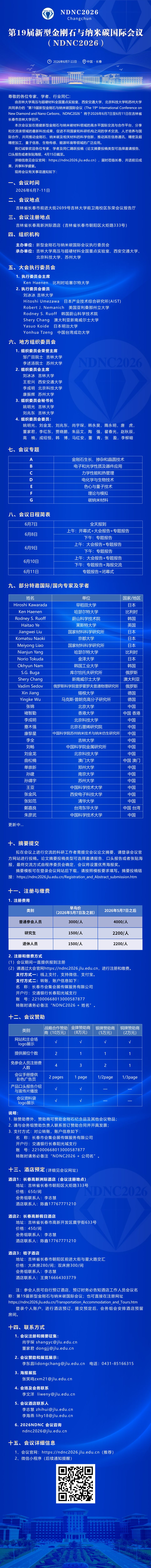 第19届新型金刚石与纳米碳国际会议(NDNC2026)第一轮通知